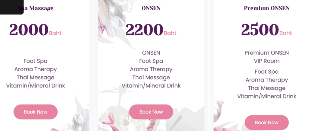 Premium Onsen:2,500B(ジャグジー完備。“Spa Massage” として足浴/アロマ/タイ・マッサージが含まれるサービス)